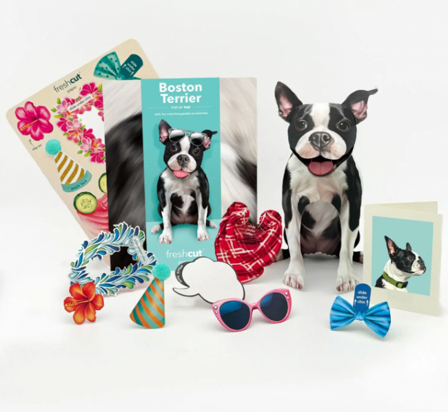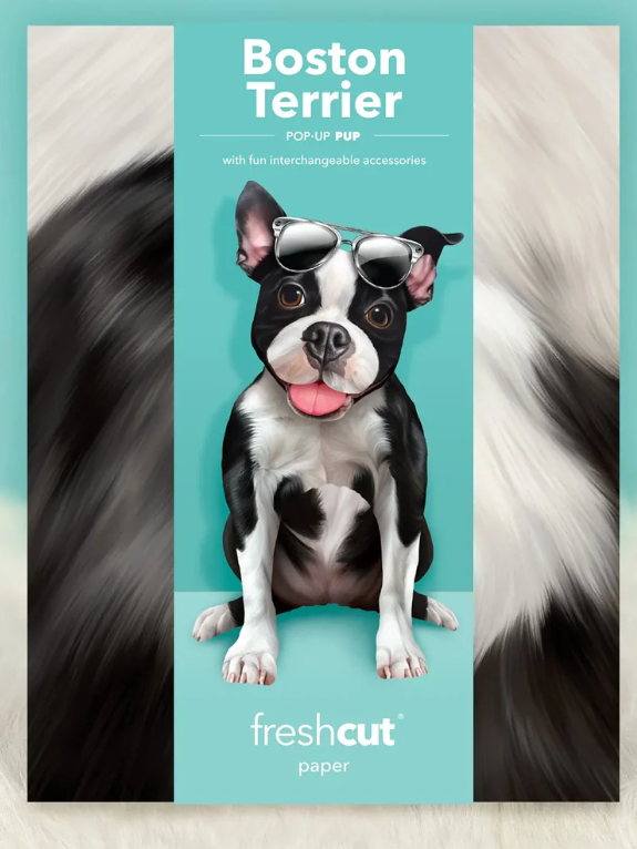 Make the moment pawsitively perfect with a Pop-Up Boston Terrier! Share the boundless-energy and fun-loving spirit of this precious pup in a simple envelope. This paper pup features the Terrier’s classic tuxedo-coat and sweet snout, and a wagging tongue too. Crafted with care, these pop-up Boston Terriers are not just cards but keepsakes that can be treasured for years to come. Each pet comes with a matching notecard, a mailing envelope, interchangeable accessories, and a customizable speech bubble for that personal touch.