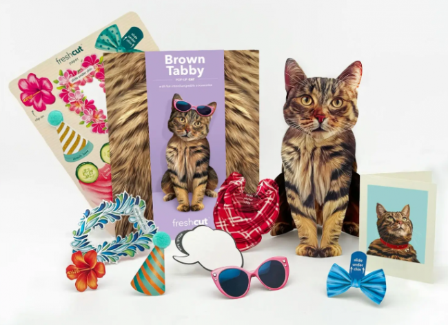Beloved for their playful charm and whiskered expressions, FreshCut Paper’s Pop-Up Brown Tabby Cat sends a little mischief and a lot of delight no matter the occasion. This paper tabby features an ornate and cozy brown tabby coat, loving eyes, and an adorable whisker-twitching grin. Each clawsome pop-up comes with a matching notecard, a mailing envelope, interchangeable accessories, and a customizable speech bubble for that purrsonal touch.