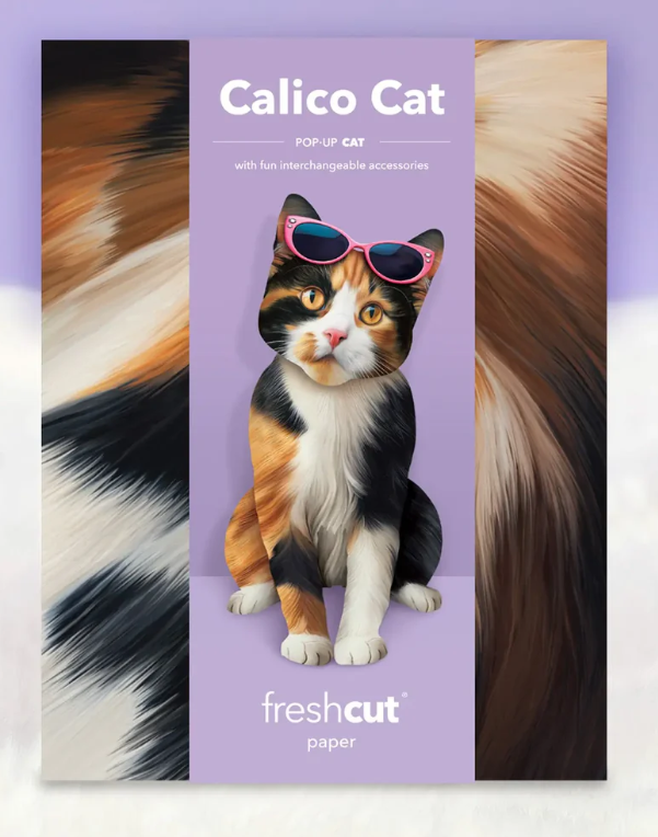 Add a splash of whimsy and joy to any occasion with a Pop-Up Calico Cat! This ornate and delightful design captures the vibrant patchwork of calico coats, bringing a burst of color and charm to your day. Each pop-up cat comes with a matching notecard, a mailing envelope, paw-some interchangeable accessories, and a customizable speech bubble to add your own purr-sonal touch. Make their day—or yours!—a little brighter and a lot more delightful with this adorable Calico.