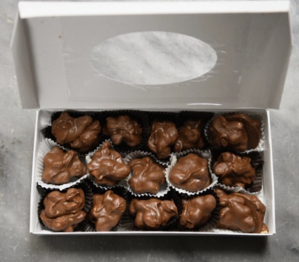 O'Shea's 1/2 Peanut Clusters Milk Chocolate- We start with fresh roasted peanuts & hand dip these in our pure milk chocolate blend to make our homemade peanut clusters. These come in a half pound window box & merchandises well on the shelf. Each of these are hand dipped on one of our original marble slabs using the finest ingredients of Georgia peanuts & our pure milk chocolate blend.
