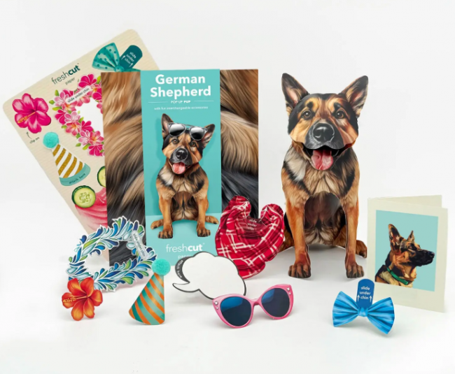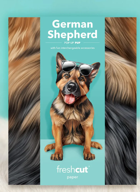 The ultimate, unique pet gift: FreshCut Paper’s Pop-Up German Shepherd will guard their hearts with love fur-ever. Perfect for German Shepherd lovers, or anyone who cherishes a steadfast friend; this pop-up card delivers smiles and goodwill in equal measure. Each pop-up pet comes with a matching notecard, mailing envelope, adorable interchangeable accessories, and a customizable speech bubble to add your personal touch.
