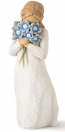 - Standing figure in cream dress, holding large bouquet of blue forget-me-not flowers up to her face