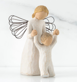 • Figure of angel in cream dress and wire wings, holding both hands of toddler in cream onesie walking in front of angel