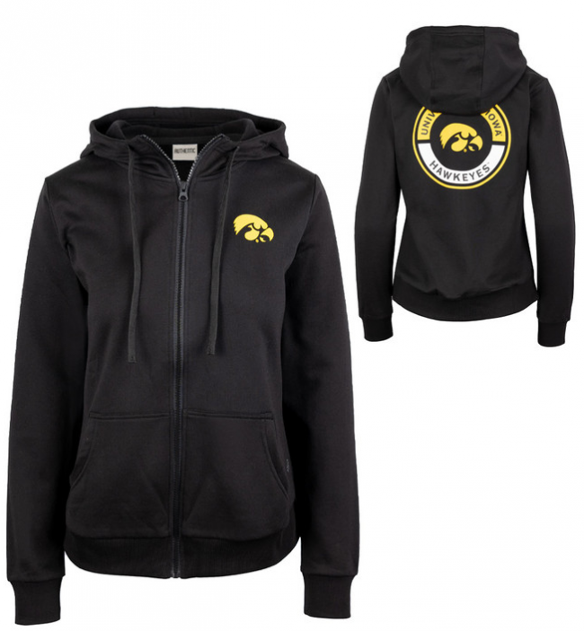 Perfect for cool games, shopping, or lounging around. This full zip hoody has a round Universit of Iowa Hawkeyes logo on back!