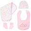 This adorable 4-piece Baby Gift Set is perfect for welcoming a little one into the world. It includes a cozy beanie hat, a pair of cute socks, a charming bib, and a soft burp cloth. Delicate bows add a sweet finishing touch to the hat and socks. Ideal for any occasion, this set makes a delightful gift for mommy's precious little princess!