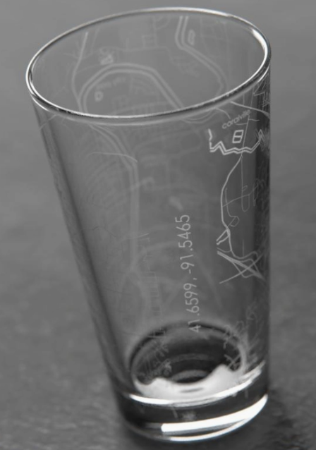 Each pint glass is precision-etched entirely around the vessel with a beautifully detailed map of Iowa City's streets, neighborhoods, and coordinates. The perfect gift for any occasion or addition to any home bar. Sturdy, high-quality glass made for a lifetime of use.