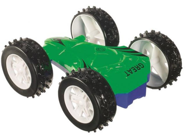 - Drives over obstacles, up walls, flips over, and just keeps going!